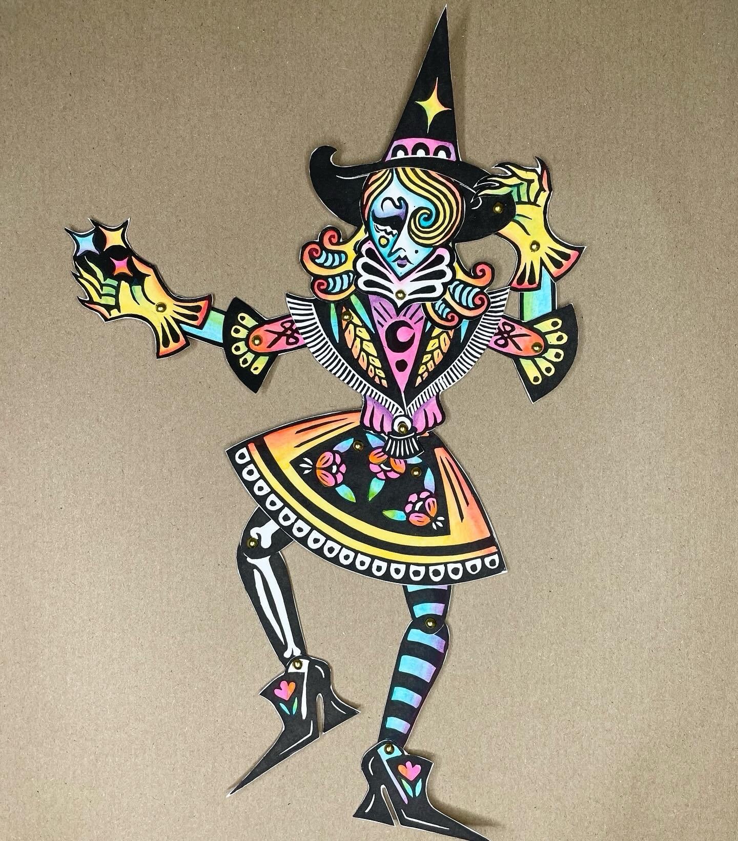 Lino print on A4 300gsm smooth watercolour paper. Can be painted with watercolour, ink, markers, pencils… Red dots indicate areas to be perforated and held together with paper fasteners. Red lines indicate cut areas that are not part of the outline.